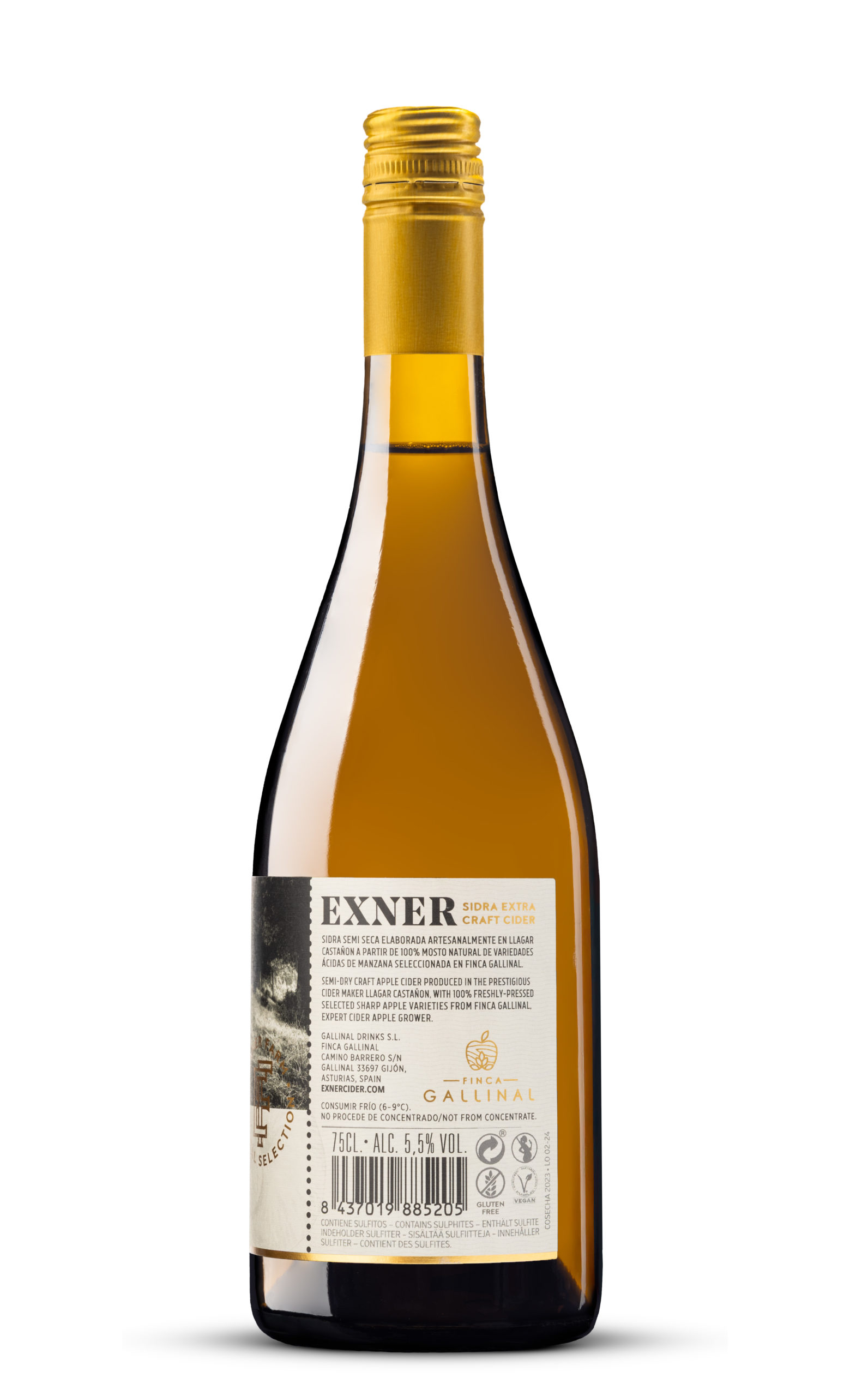 3 botellas Exner Sidra Artesana de calidad, en formato de botella de 75 cl, elaborada artesanalmente a partir de 100% mosto natural de variedades ácidas de manzana de sidra previamente seleccionada en nuestra finca de Asturias, Finca Gallinal. Resultado de 5 años de cuidadoso e intenso trabajo en la selección de variedades y procesos de cosecha y fermentación. NATURAL. NO PROCEDE DE CONCENTRADO. SIN GLUTEN. VEGANA. Una sidra gourmet que sorprenderá.